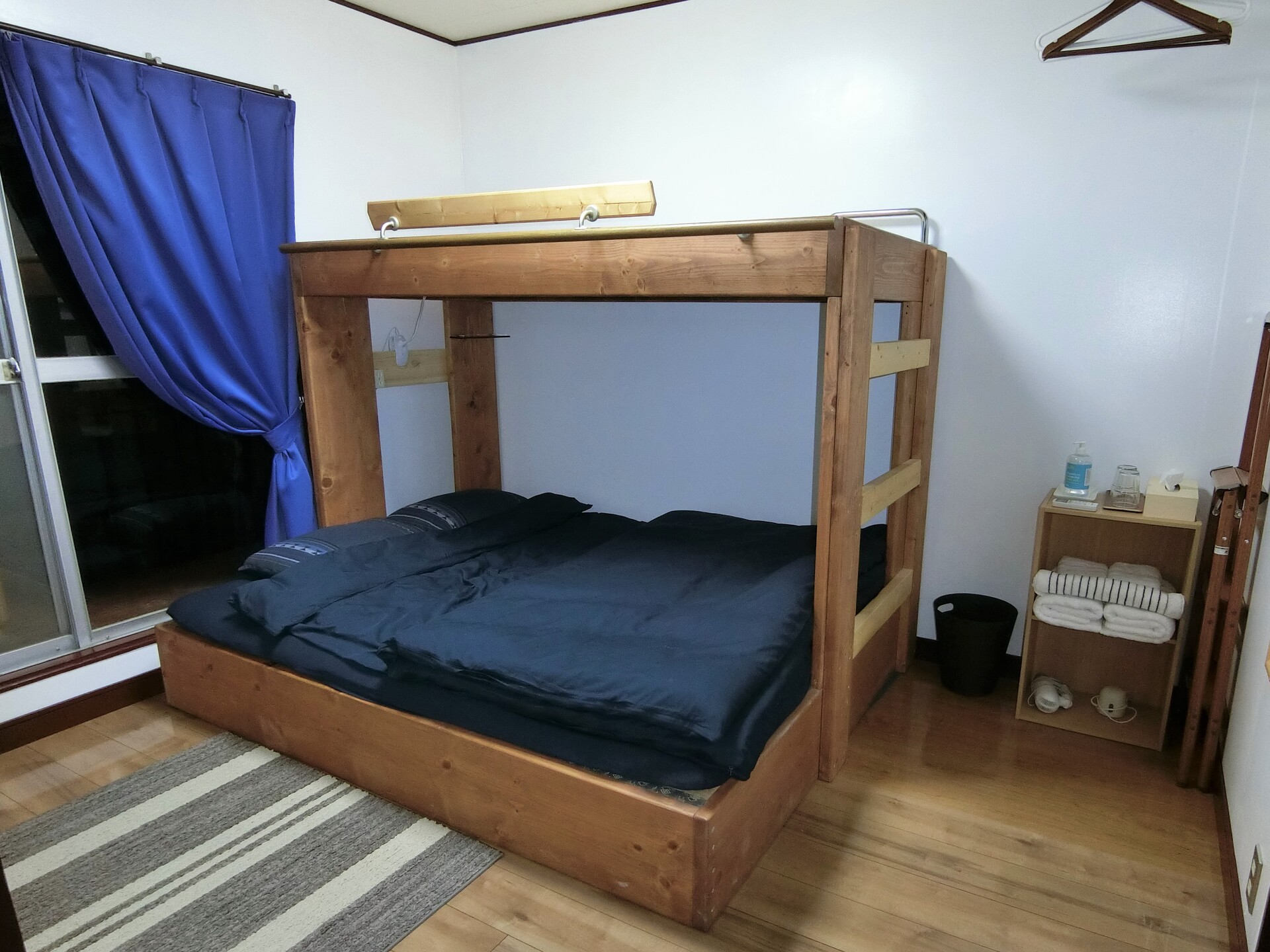 2階洋室(下段クイーンベッド、上段シングルベッドの2段ベッド、ミニテーブルセット、ベランダ)エアコン、バスタオル、フェイスタオル、コップ、ヘアドライヤー付き